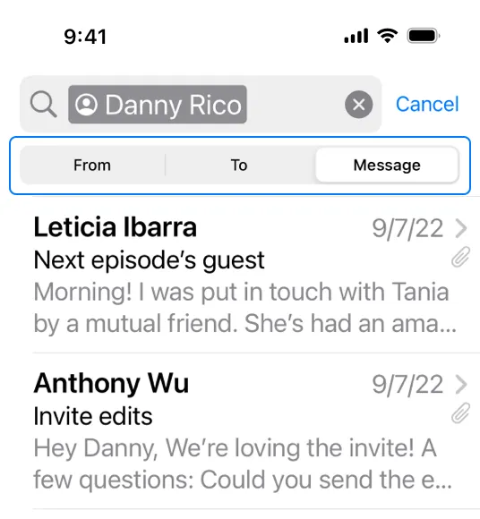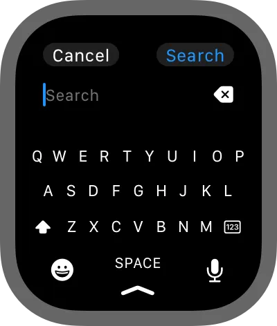 When someone taps the search field, the system displays a text-input control that covers the entire screen. The app only returns to the search field after they tap the Cancel or Search button.