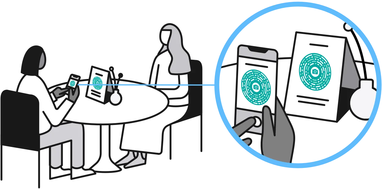 The scan-only variant uses a camera icon in its center to let people know to use the Camera app or the Code Scanner in Control Center to scan the App Clip Code. The NFC-integrated variant uses an iPhone icon at its center that guides people to hold their device close to the App Clip Code or to scan it using the NFC Tag Reader in Control Center. People can also scan an NFC-integrated App Clip Code with the Camera app or the Code Scanner in Control Center. For example: