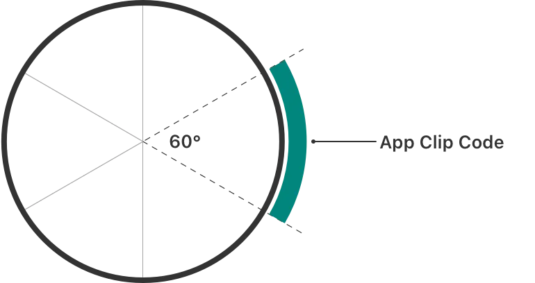 Provide enough space between an App Clip Code and adjacent App Clip Codes, graphics, or materials. The minimum clear space around an App Clip Code is equal to the space between the center glyph and the circular code. If you place your App Clip Code next to another App Clip Code or other machine-readable code, leave enough clear space to allow for reliable scanning of each code.