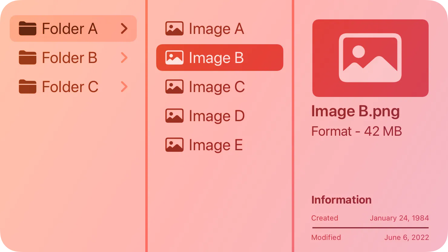 Consider using a column view when you have a deep data hierarchy in which people tend to navigate back and forth frequently between levels, and you don’t need the sorting capabilities that a list or table provides. For example, Finder offers a column view (in addition to icon, list, and gallery views) for navigating directory structures.