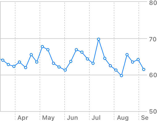 사람들이 차트에서 중요한 변경 사항을 확인할 수 있도록 도와주세요. 예를 들어, 마크나 축이 변경될 때 사람들이 이를 인지하지 못한다면 차트를 잘못 읽을 수 있습니다. 이러한 변경 사항에 애니메이션을 적용하면 사람들이 이를 알아차리는 데 도움이 될 수 있지만 VoiceOver 사용자와 애니메이션을 끄는 사람들이 알 수 있도록 다른 방법으로도 변경 사항을 강조 표시해야 합니다. 개발자 지침은 UIAccessibility.Notification(UIKit) 또는 NSAccessibility.Notification(AppKit)을 참조하세요.