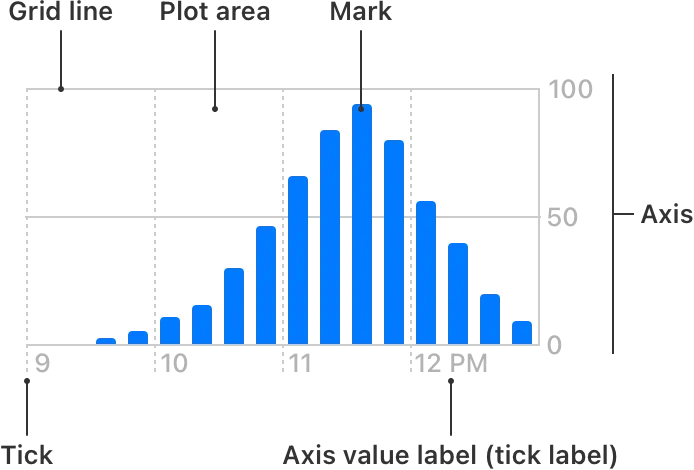 보조 기술에서 축 및 눈금에 대해 표시되는 텍스트 레이블을 숨깁니다. 축 및 눈금 레이블은 사람들이 차트의 추세를 시각적으로 평가하고 표시 값을 추정하는 데 도움이 됩니다. VoiceOver 사용자는 접근성 레이블과 오디오 그래프를 통해 표시 값과 추세 정보를 얻을 수 있으므로 일반적으로 보이는 레이블의 콘텐츠가 필요하지 않습니다.