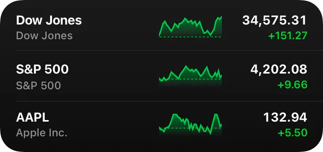 의미를 전달하는 화려한 배경을 제공합니다. 기본적으로 Smart Stack의 위젯은 검은색 배경을 사용합니다. 추가적인 의미를 제공하는 사용자 지정 색상을 사용하는 것을 고려해 보세요. 예를 들어 Stocks 앱은 주식 가치 하락을 위해 빨간색 배경을 사용하고, 주식 가치가 상승할 경우 초록색 배경을 사용합니다.
