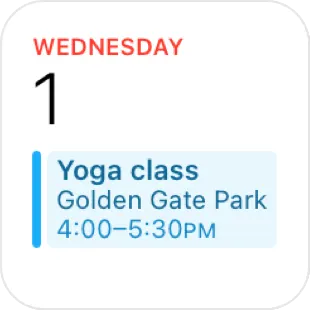 In each size, display only the information that’s directly related to the widget’s main purpose. In larger widgets, you can display more data — or more detailed visualizations of the data — but you don’t want to lose sight of the widget’s primary purpose. For example, all Calendar widgets display a person’s upcoming events. In each size, the widget remains centered on events while expanding the range of information as the size increases.