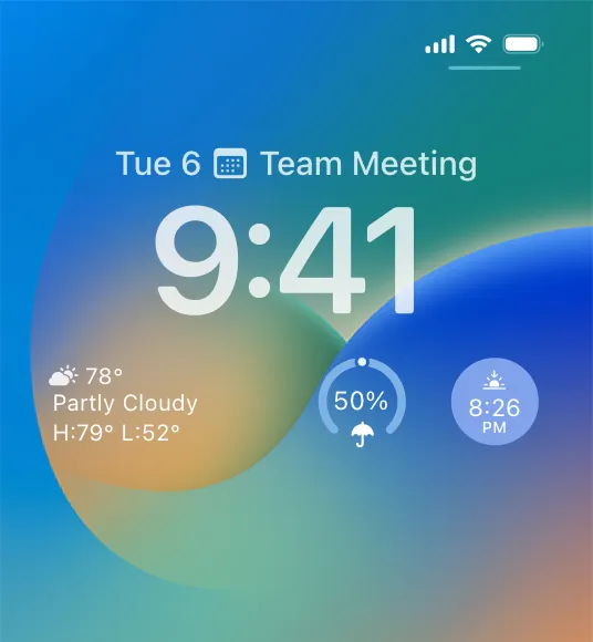 Widgets on the Lock Screen are functionally similar to watch complications and follow design principles for Complications in addition to design principles for widgets. Both support Always-On displays and emphasize glanceable content within their limited space. Provide useful information in your Lock Screen widget, and don’t treat it only as an additional way for people to launch into your app. Additionally, the vibrant rendering mode that widgets on the Lock Screen use is similar to the accented rendering mode for watch complications because they both communicate information without relying on color only. In many cases, a design for complications also works well for widgets on the Lock Screen (and vice versa), so consider creating them in tandem.