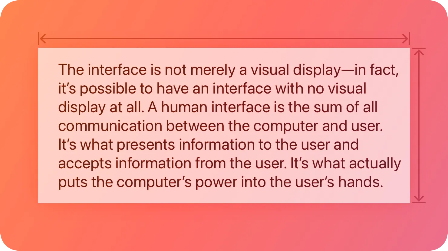 Keep text legible. Although you can use multiple fonts, colors, and alignments in creative ways, it’s essential to maintain the readability of your content. It’s a good idea to adopt Dynamic Type so your text still looks good if people change text size on their device. Be sure to test your content with accessibility options turned on, such as bold text. For guidance, see Accessibility and Typography.