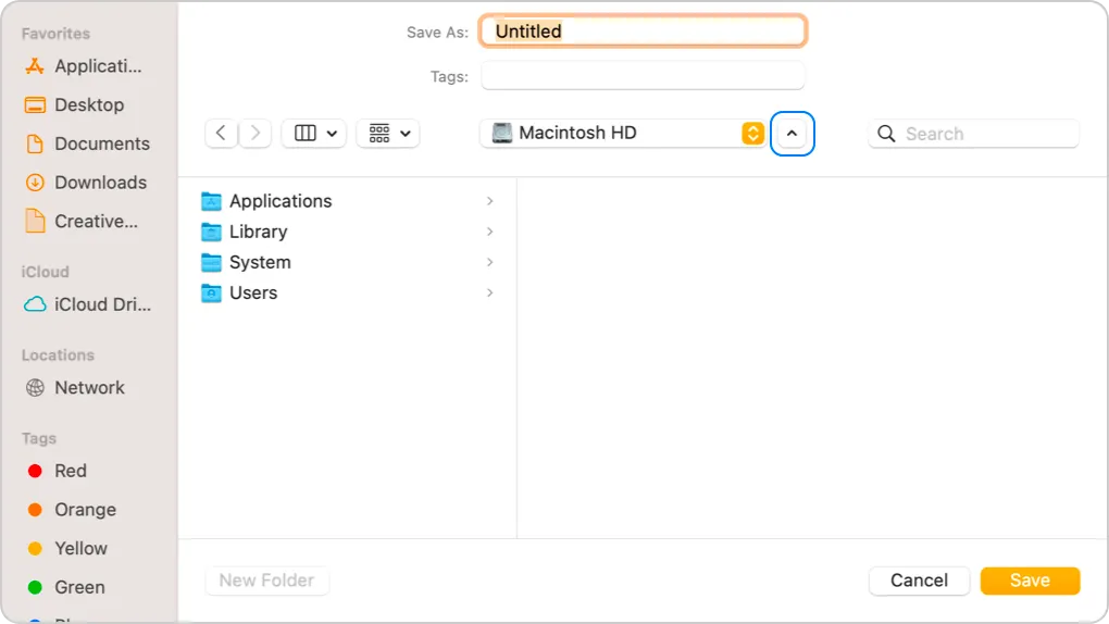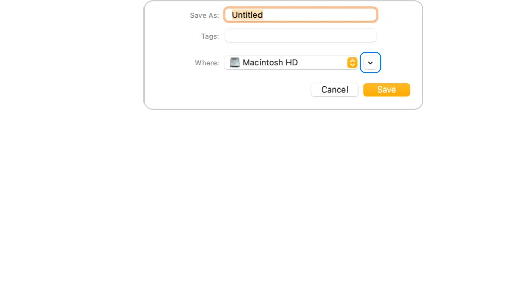 디스클로저 트라이앵글(Disclosure button)은 특정 컨트롤과 관련된 기능을 표시하거나 숨깁니다. 예를 들어 macOS 저장 시트에는 다른 이름으로 저장 텍스트 필드 옆에 공개 버튼이 표시됩니다. 사람들이 이 버튼을 클릭하거나 탭하면 저장 대화 상자가 확장되어 문서의 출력 위치를 선택하기 위한 고급 탐색 옵션이 제공됩니다.