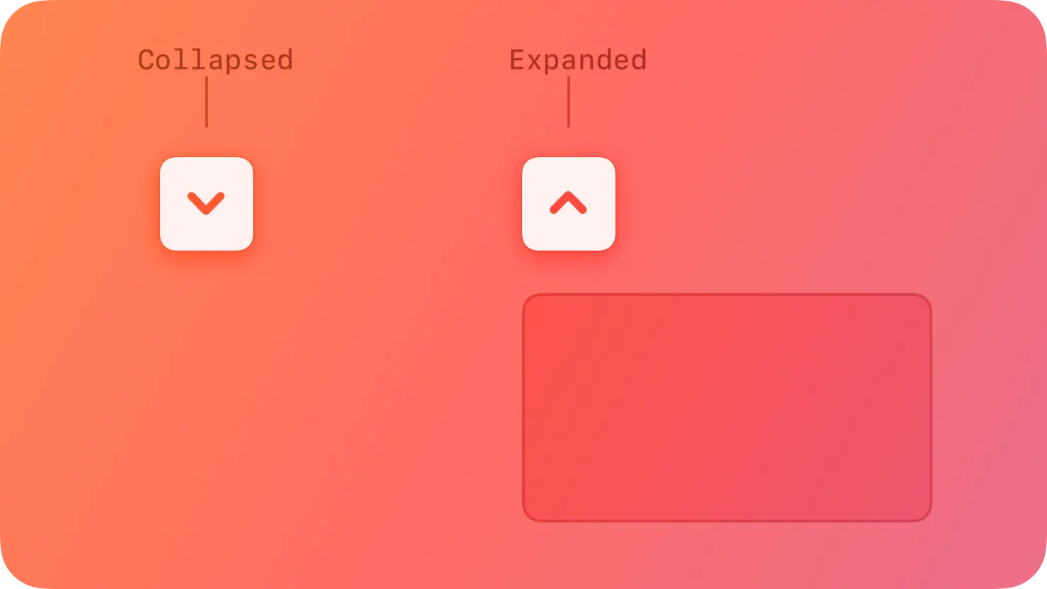 콘텐츠가 숨겨져 있으면 공개 버튼이 아래를 가리키고, 콘텐츠가 표시되면 위를 가리킵니다. 공개 버튼을 클릭하거나 탭하면 이 두 상태 사이가 전환되며, 콘텐츠에 맞게 보기가 확장되거나 축소됩니다.