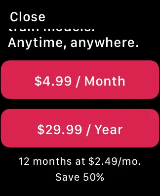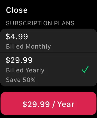 Make subscription options easy to compare on a small screen. People need to understand the terms of each subscription option before they can choose one. Aim to display the duration and discount information for each option in a compact way that’s easy to scan and compare. Here are two ways you might present subscription options in your watchOS app: