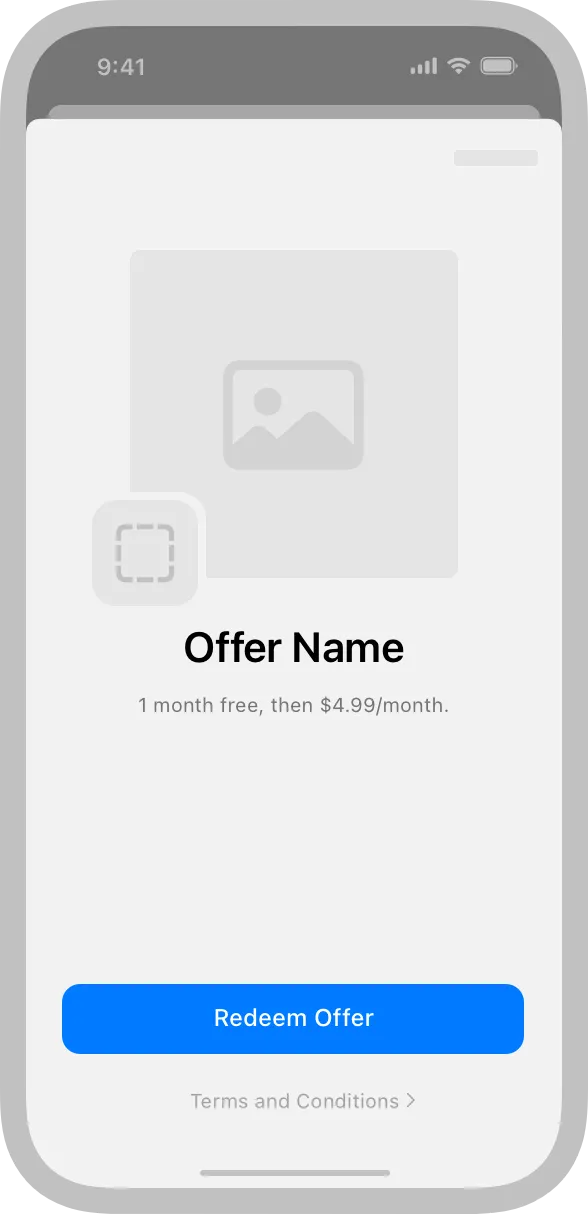 Consider supporting offer redemption within your app. The system automatically provides screens that present the offer-redemption flow, whether people redeem the offer in your app or in the App Store. When you use StoreKit API to let people redeem offer codes within your app, the only custom UI you need to create is one that initiates the system-provided flow. For developer guidance, see presentOfferCodeRedeemSheet(in:) and offerCodeRedemption(isPresented:onCompletion:). There are several natural places to provide this custom UI. For example, you could add a “Redeem Code” button to your paywall, onboarding screens, or your app’s settings screen.