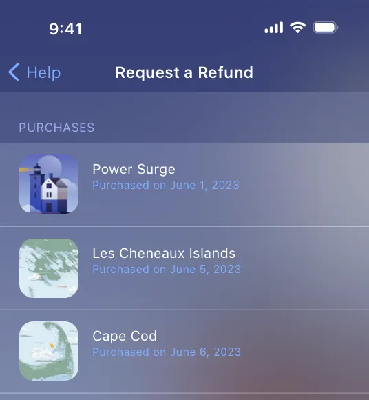 Make it easy for people to request a refund. Although your purchase-help screen can offer useful information and alternative solutions, make sure this content doesn’t create a barrier to requesting a refund. For example, avoid making people scroll or open another screen to reveal your refund-request button. When people choose your refund-request item, they automatically enter the system-provided refund flow shown below.