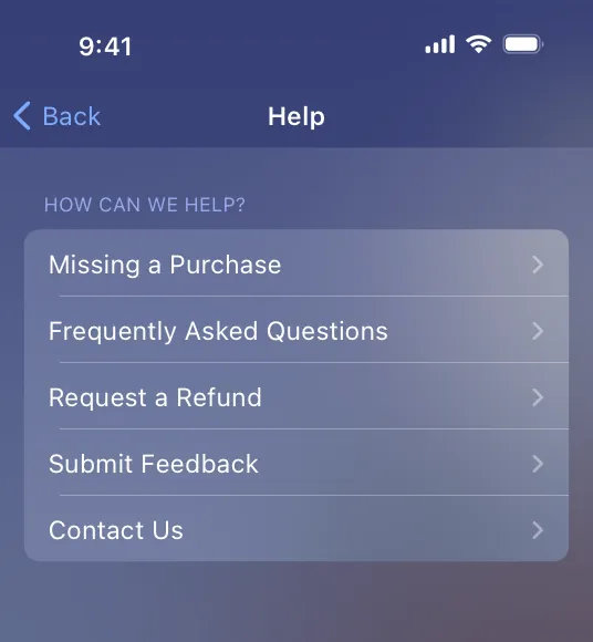 Provide help that customers can view before they request a refund. In addition to including a link to the system-provided refund flow, your custom purchase-help screen can provide assistance you tailor to your app. For example, your custom screen might help people resolve problems with missing purchases, answer frequently asked questions about the in-app purchases you offer, and give people ways to submit feedback or contact you directly for support.