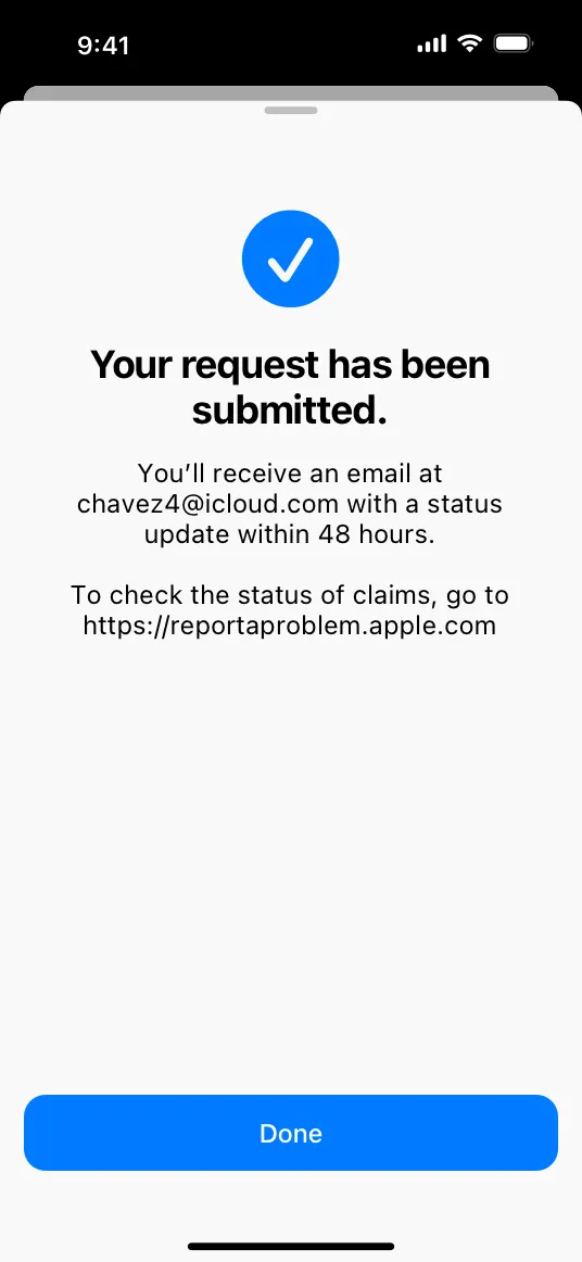 Use a simple title for the refund action, like “Refund” or “Request a Refund”. The system-provided refund flow makes it clear that people request a refund from Apple, so there’s no need to reiterate this information.