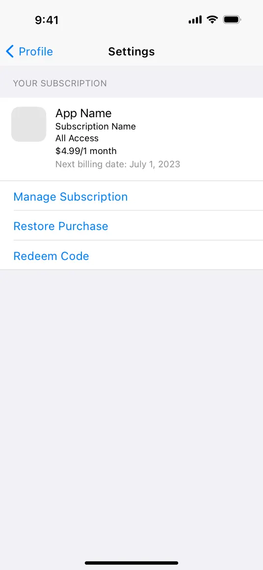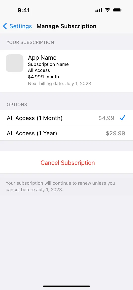 Supporting subscription management means people can upgrade, downgrade, or cancel a subscription without leaving your app. Offering subscription management within your app also gives you a natural place to provide help for common subscriber issues and present alternative offers for people to consider.