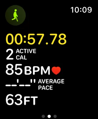 Use a distinct visual appearance to indicate an active workout. During a workout, people appreciate being able to recognize an active session at a glance. The metrics page can be a good way to show that a session is active because the values update in real time. In addition to displaying updating values, you can further distinguish the metrics screen by using a unique layout.