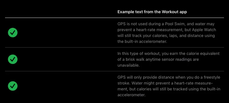 사람들이 운동 중 센서 데이터를 사용할 수 없는 경우 앱에서 기록하는 건강 정보를 이해할 수 있도록 도와주세요. 예를 들어, 물 안에서는 심박수 측정이 방지 되지만, 앱은 사람들이 수영한 거리와 칼로리 소모량과 같은 데이터를 기록할 수 있습니다. 앱이 수영 또는 기타 운동 유형을 지원하는 경우 아래와 같이 시스템에서 제공하는 운동 앱에서 사용하는 언어와 유사한 언어를 사용하여 상황을 설명하세요: